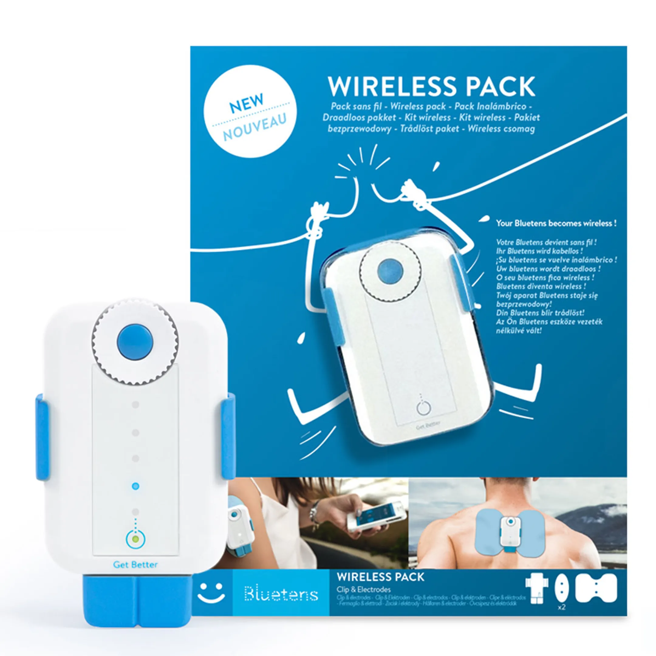 Le Pack sans fil spécialement conçu pour les modes Soigner et Relaxer de l’App, vous permet d’utiliser votre Bluetens sans son câble électrodes d’origine.