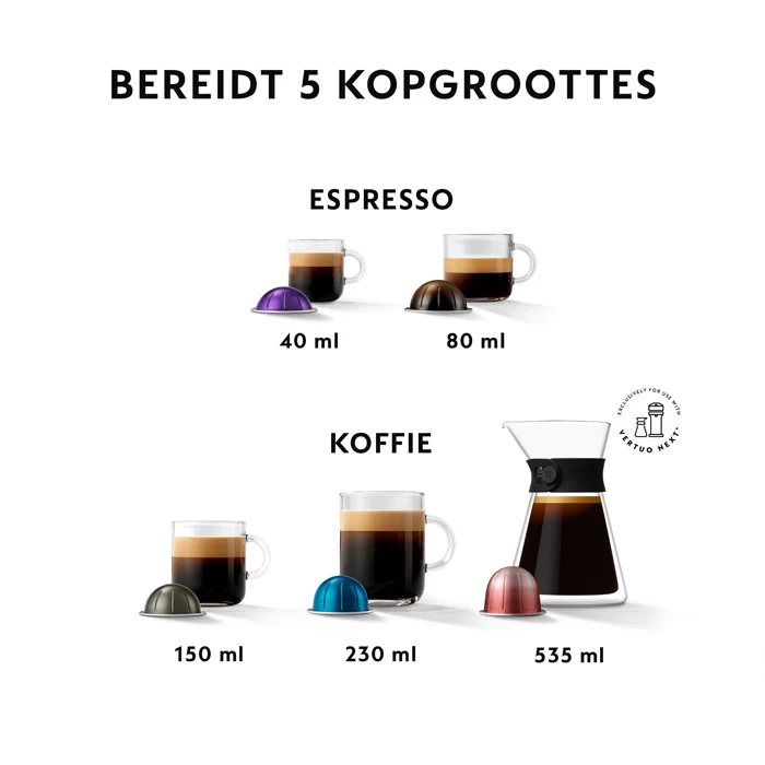 Eén Nespresso-espressomachine voor 6 zwarte koffiematen: espresso, dubbele espresso, gran lungo, mok/koffie, alto en carafe via 4 verschillende koffiepodmaten.
