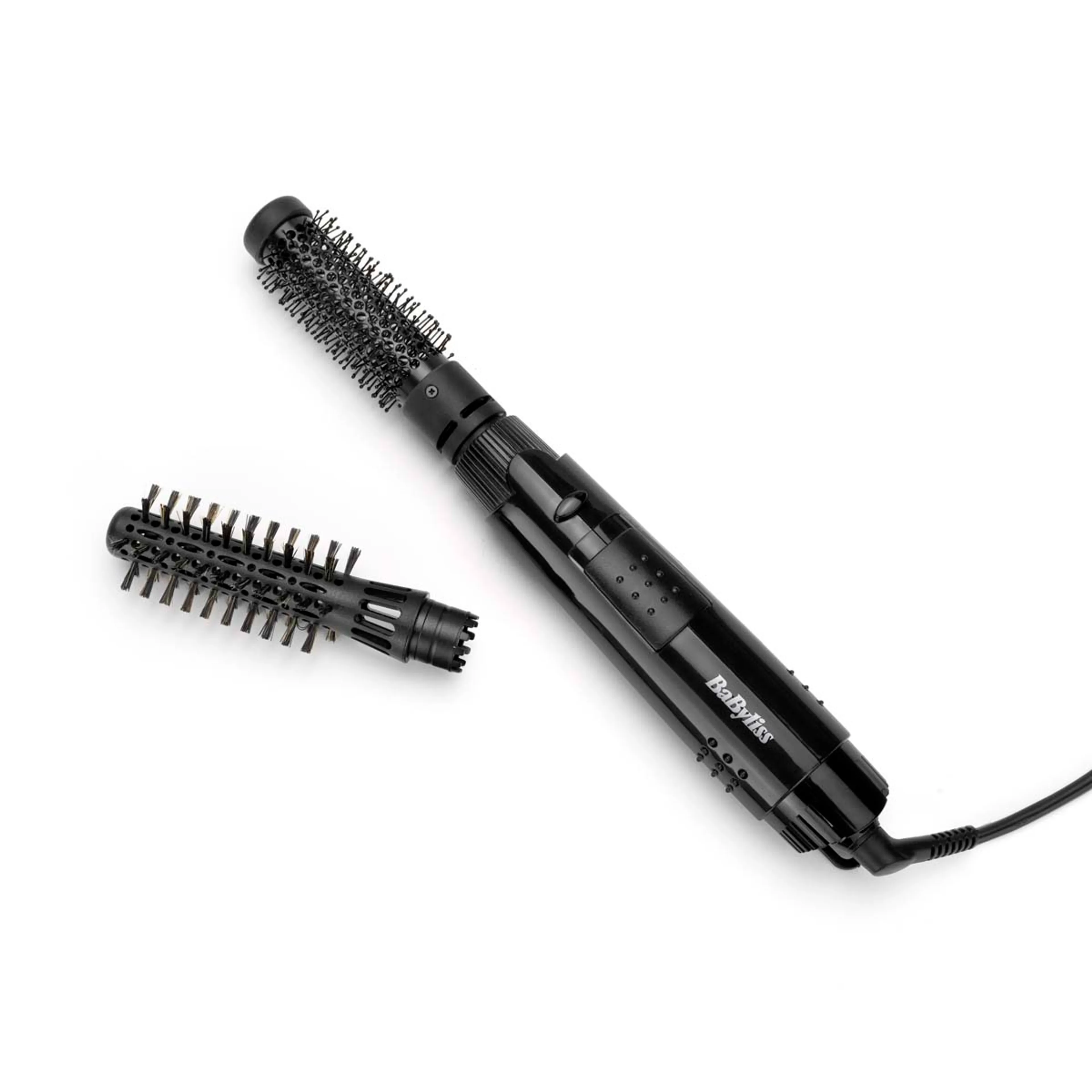 300W warmeluchtborstel met 2 verwisselbare opzetkoppen die ideaal zijn voor kortere kapsels. De opzetborstel van 19mm met zachte haren en 23mm thermische borstel creëren body en vorm in het haar.